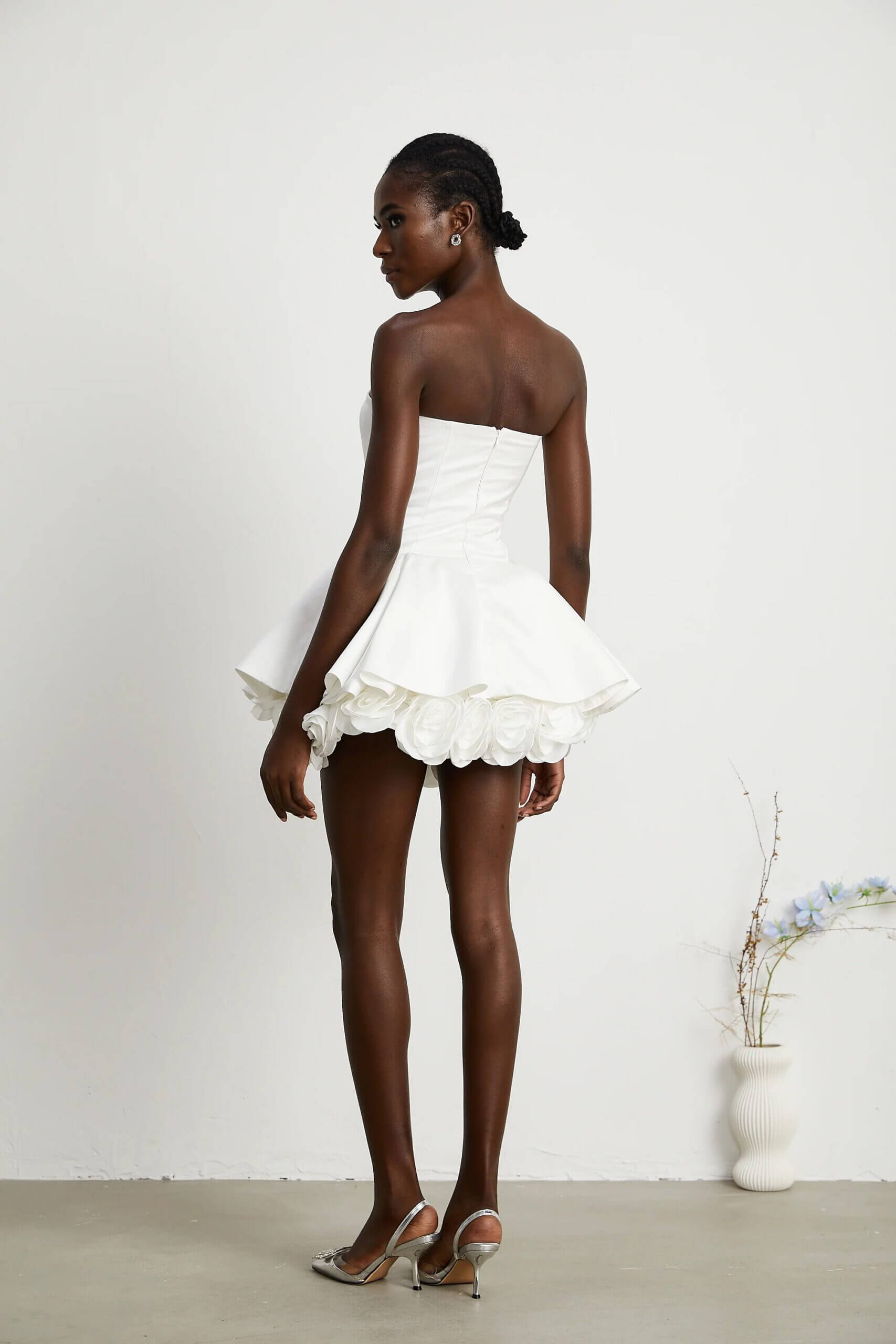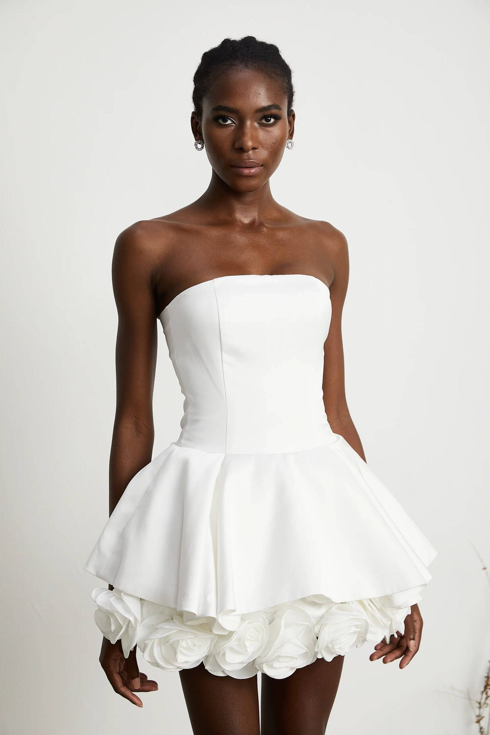 Camille – Mini robe bustier blanche effet pétales superposés